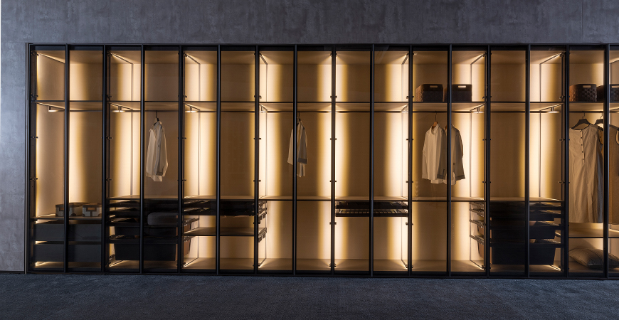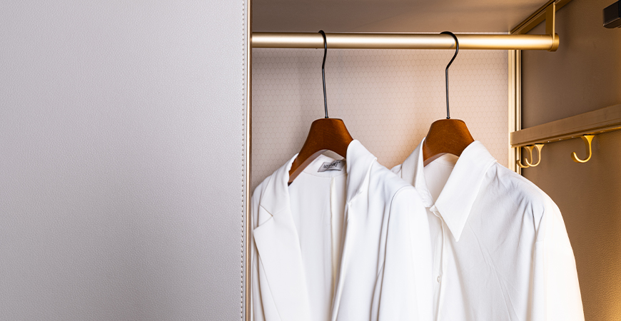 柜內(nèi)線燈位于立柱槽口向內(nèi)照射,不刺眼,且光線不會被懸掛的衣物等收納物品遮擋,方便物品的取用。